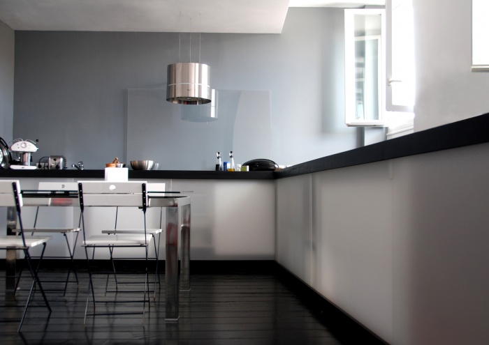 La volonté initiale des propriétaires était de créer un seul et unique espace cuisine-séjour pour profiter au maximum des volumes et de la luminosité. Paradoxe de cet appartement, les fenêtres donnant sur la rue avaient une hauteur d’allège particulièrement haute (1,40 m), empêchant toute vue directe vers la ligne d’horizon et créant une sensation d’enfermement. Les propriétaires n’avaient pas perçu cette singularité. Le parti pris a été de construire le projet autour de cette problématique et d’en tirer bénéfice.
