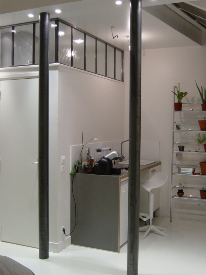 Aménagement d'une petite surface. Apport de lumière dans la salle de bain par la création d'une partie vitrée en partie haute de cloison. Sol en résine blanche permettant de donner plus de clarté et d'agrandir l'espace.